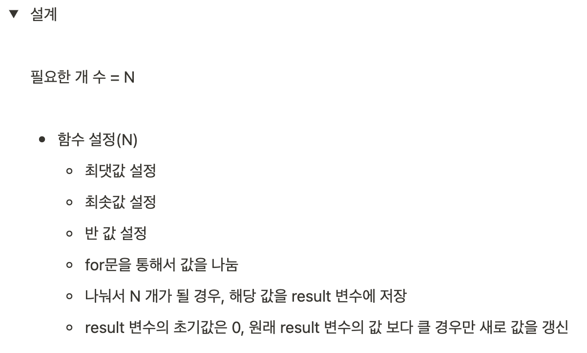 result = for문에서 계산된 결과가 N과 같다면 result 변수에 저장한다. 단, result 변수의 초기값은 0으로 시작하고, 최대의 값을 구해야 하므로 result의 값 보다 큰 경우 갱신하도록 한다.