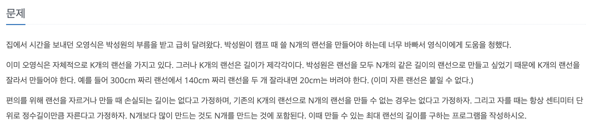 const 랜선: number[] = [802, 743, 457, 539] 이렇게 랜선 4개가 있다면 여기서 랜선 11개를 가져가야 할 때 최대로 자를 수 있는 길이를 구하라는 것이다.