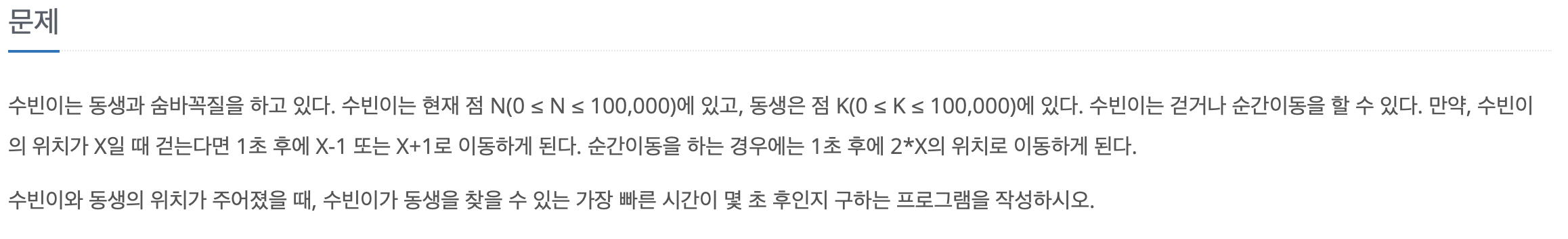 초기에 queue.push([N, 0])을 넣는다. 이 경우 N == K 라면 바로 반복문이 종료되고 time인 0이 출력 될 것이다.