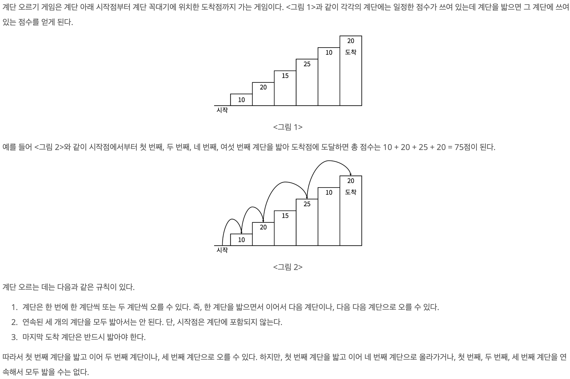 각 계단에 쓰여 있는 점수가 주어질 때 이 게임에서 얻을 수 있는 총 점수의 최댓값을 구하는 프로그램을 작성하시오.