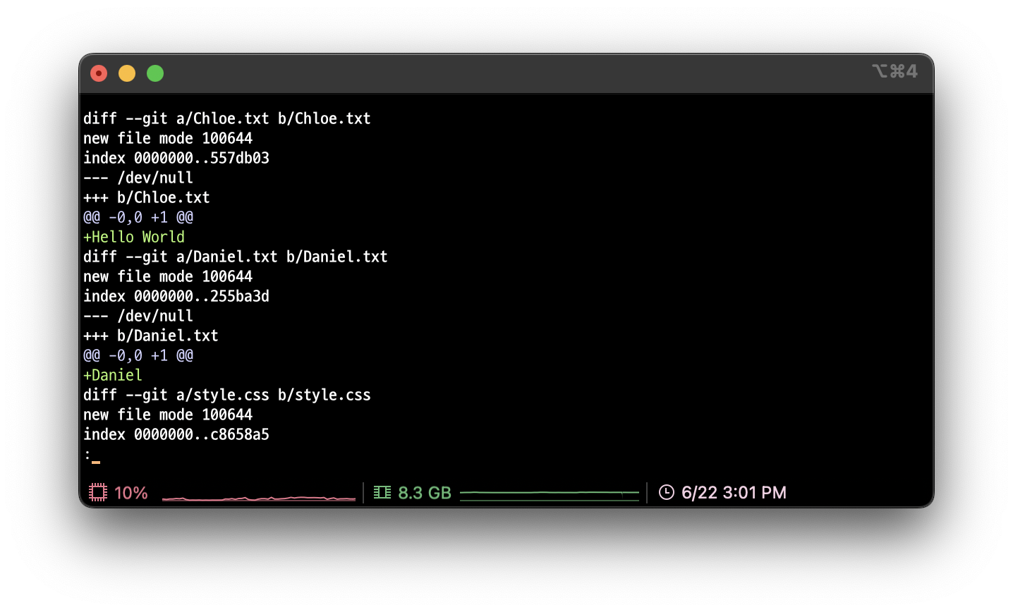 이 부분은 a/Chloe.txt 파일과 b/Chloe.txt 파일을 비교했다는 의미이다.