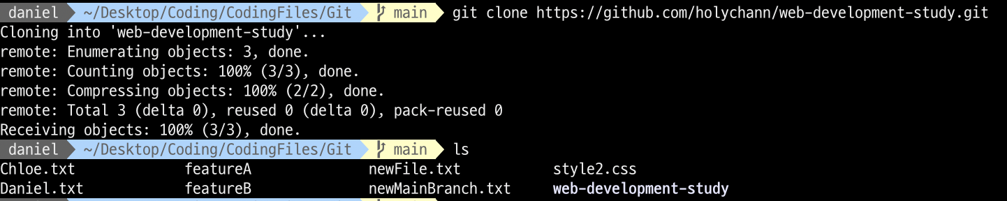 다음과 같이 git clone URL붙여넣기를 하면 파일이 하나 추가된다.(보통은 레포지토리 이름으로 생성됨)