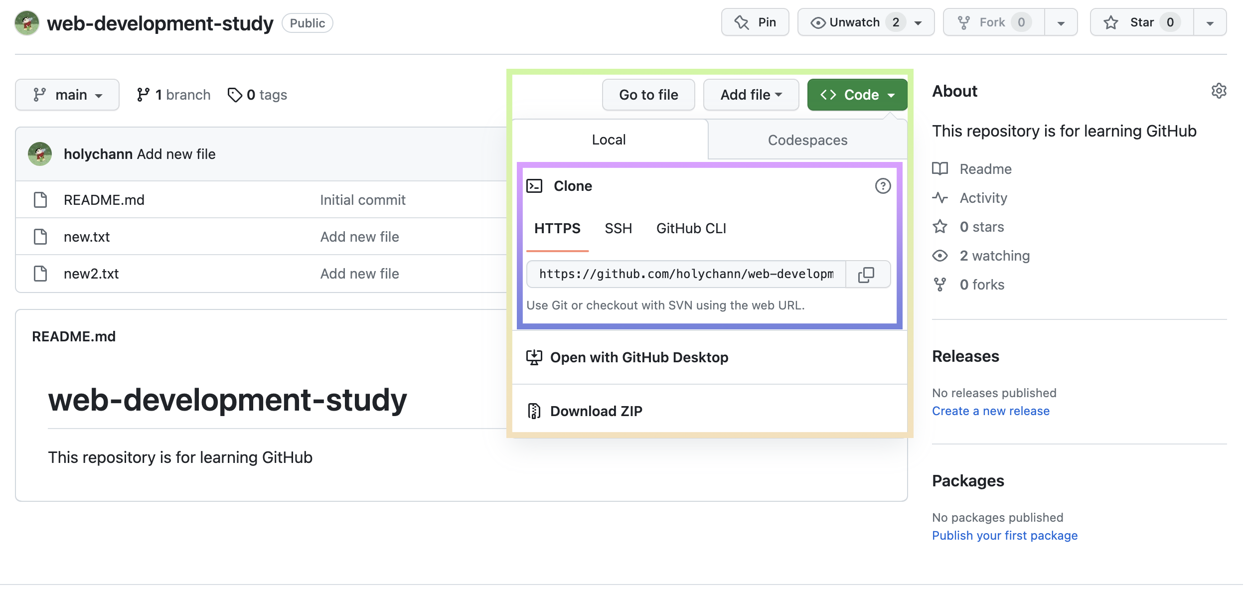 연결하려는 Repository에 들어가서 <>Code 버튼을 누른다.