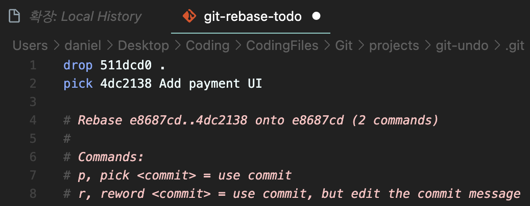 삭제하려는 commit을 drop으로 바꾸어 주고 저장한다.