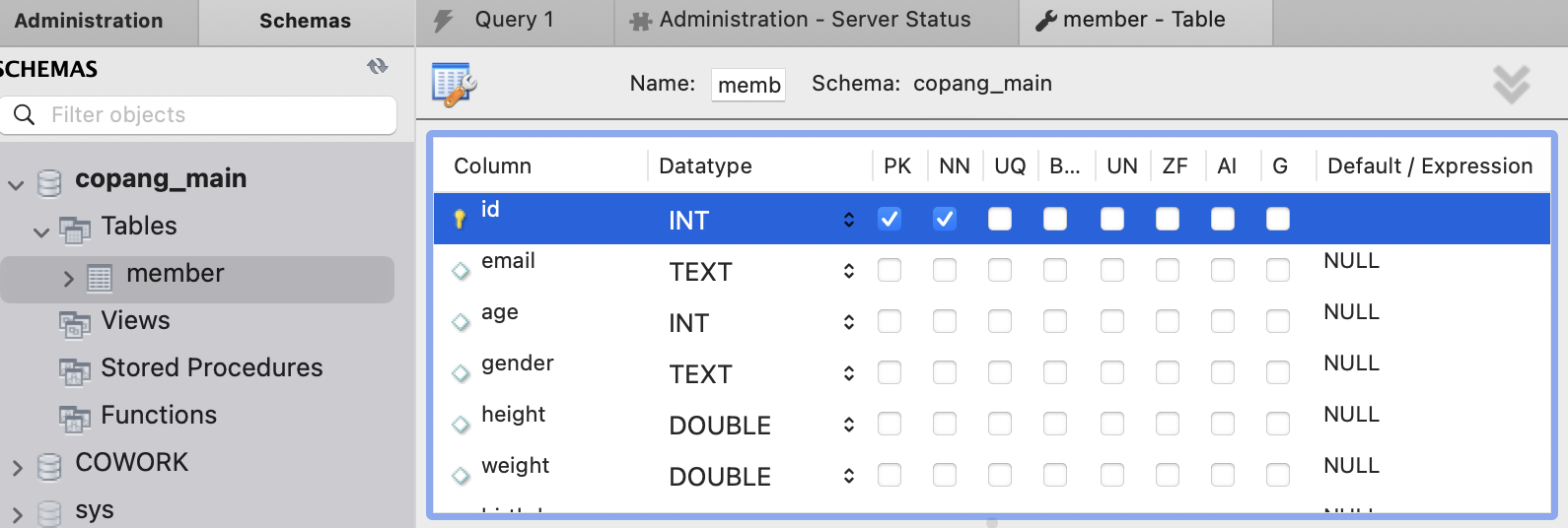 query 창에 PK 네모박스 체크, NN(Not Null)은 자동으로 체크됨.
