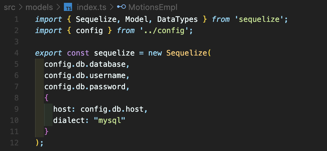 그리고 .ts 파일을 만들어 주어 sequelize와 위에서 설정해준 config.ts 파일을 불러와준다.