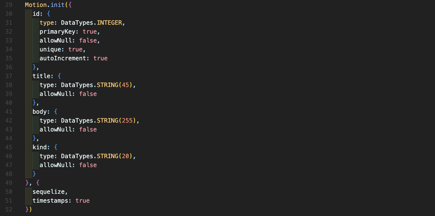 일단 queryInterface.createTable로 테이블을 만들자. 첫 번째 인자는 테이블의 이름. 두 번째 인자는 컬럼 설정이다.